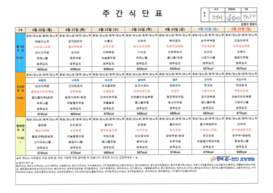 이편안모습 주간식단표 4/20~4/26 페이지 정보 작성일 26-04-17 10:55 조회 34회 본문 맛있게 드시고 건강하세요~~ 이전글4/27~5/3 다음글4/13~4/19 목록