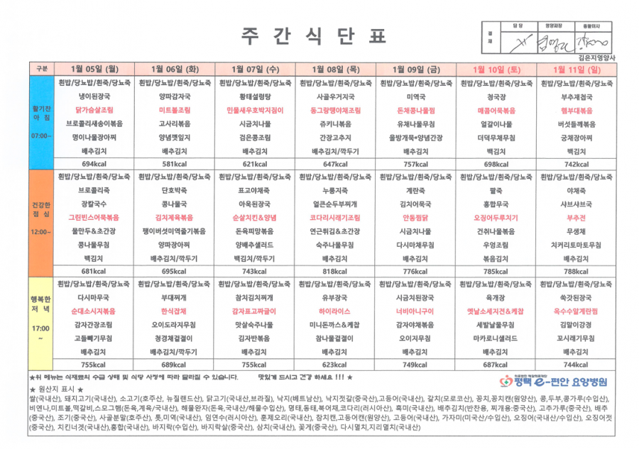 이편안모습 주간식단표 1/5~1/11 페이지 정보 작성일 25-12-31 16:43 조회 20회 본문 맛있게 드시고 건강하세요~~ 이전글1/12~1/18 다음글12/29~1/4 목록
